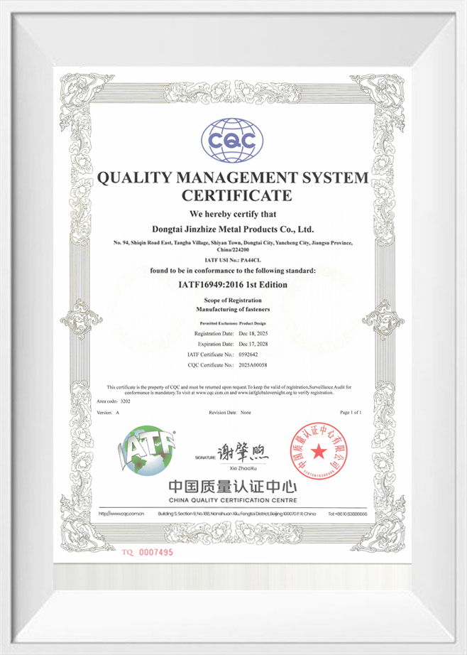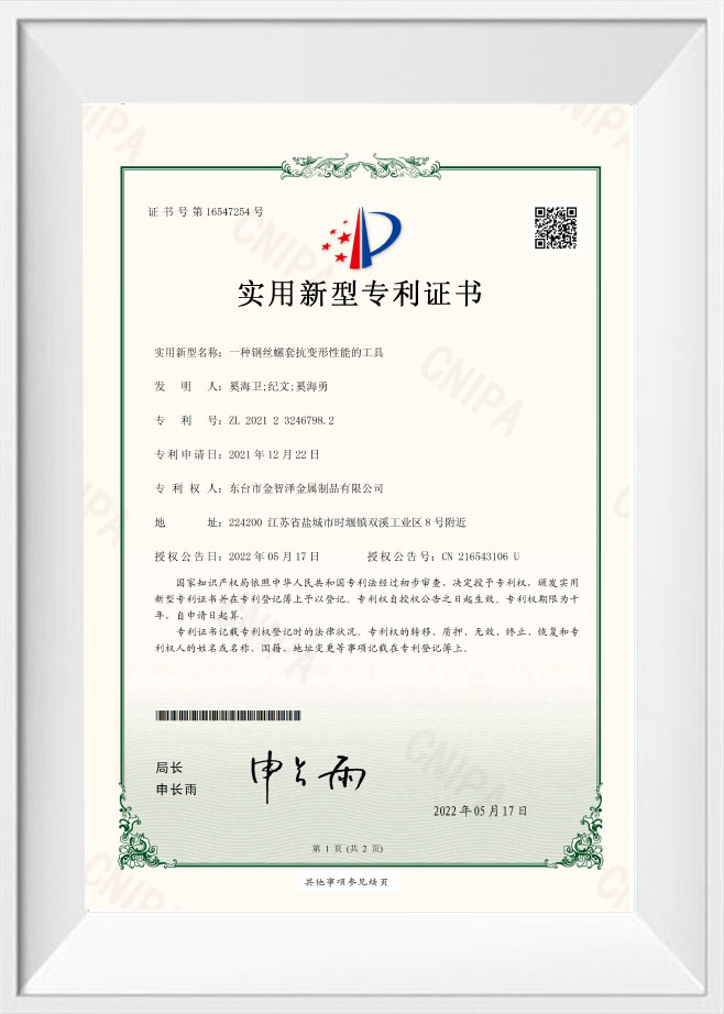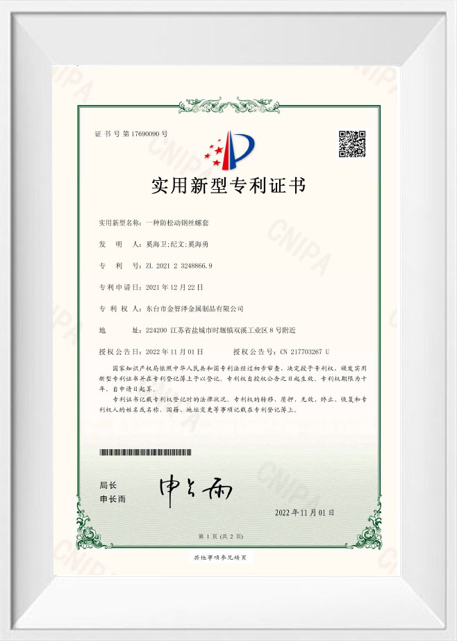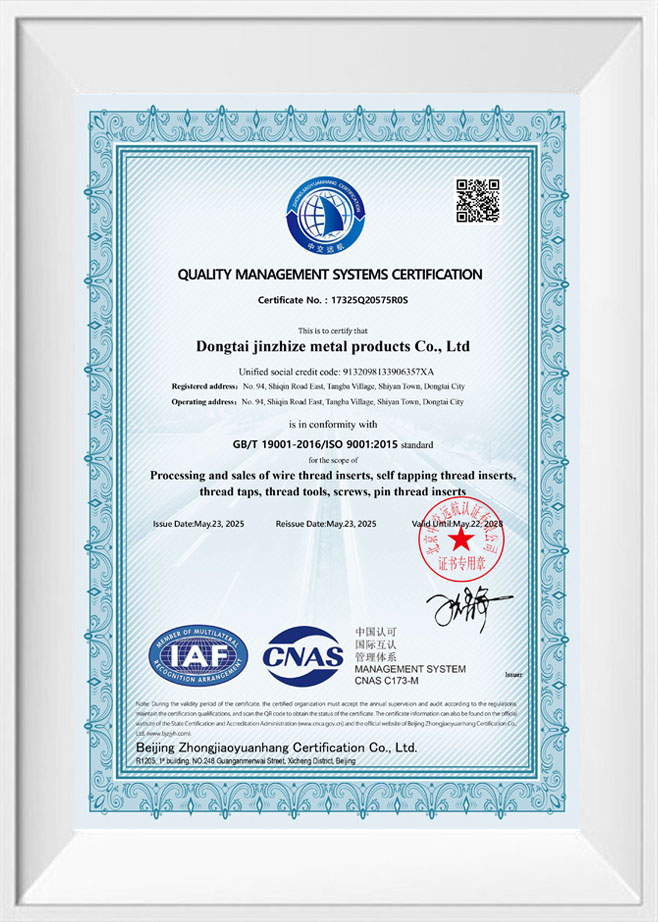 Dongtai Jinzhize Metal Products Co., Ltd. est une usine de fabrication spécialisée dédiée aux produits de connexion filetés pour les secteurs automobile et aérospatial. Nous produisons principalement des inserts de fil hélicoïdal, des inserts autotaraudeurs, des inserts de verrouillage de clé, des adaptateurs filetés, des bouchons d'huile, ainsi que des robinets et des outils d'installation correspondants.